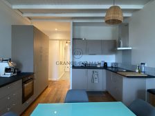 L’appartement comprend une agréable pièce de vie avec parquet d’origine, cheminée, murs en pierre apparente et 3 grandes fenêtres bien exposées. La cuisine équipée est ouverte sur le séjour.